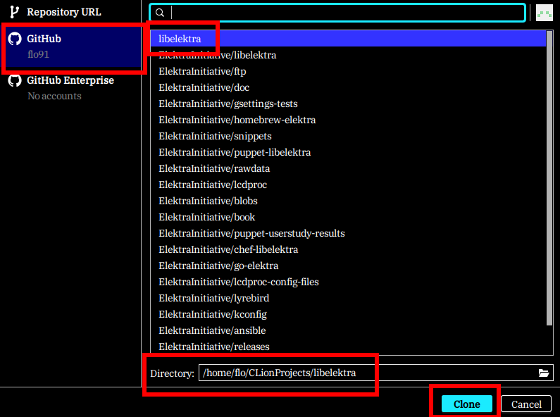 A list of repositories should be displayed. Select the entry libelektra to use your forked repository. At the bottom of the window, you can select a folder where you want to store your local copy and then click the button Clone.